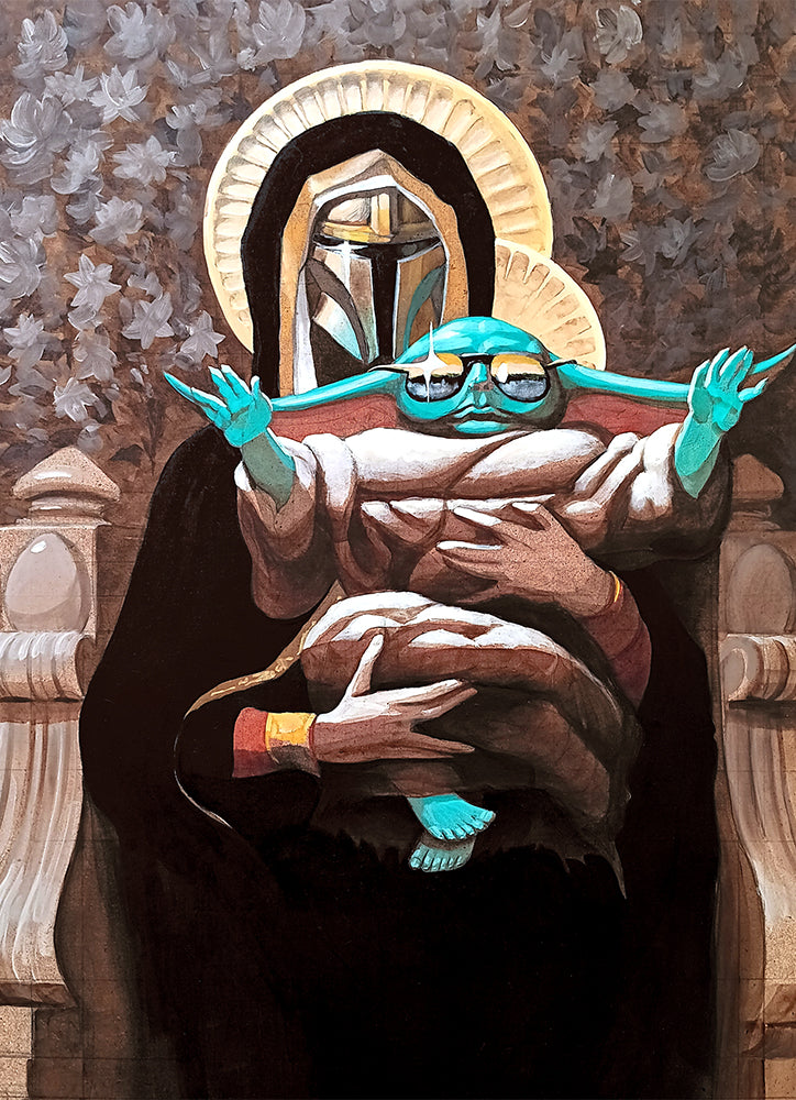 Dadalorian Mandonna and Rock Star Child is the next installment to the Multiverse Wars chapter of Modernizing the Masters by living human contemporary American artist C.S.Hawks.